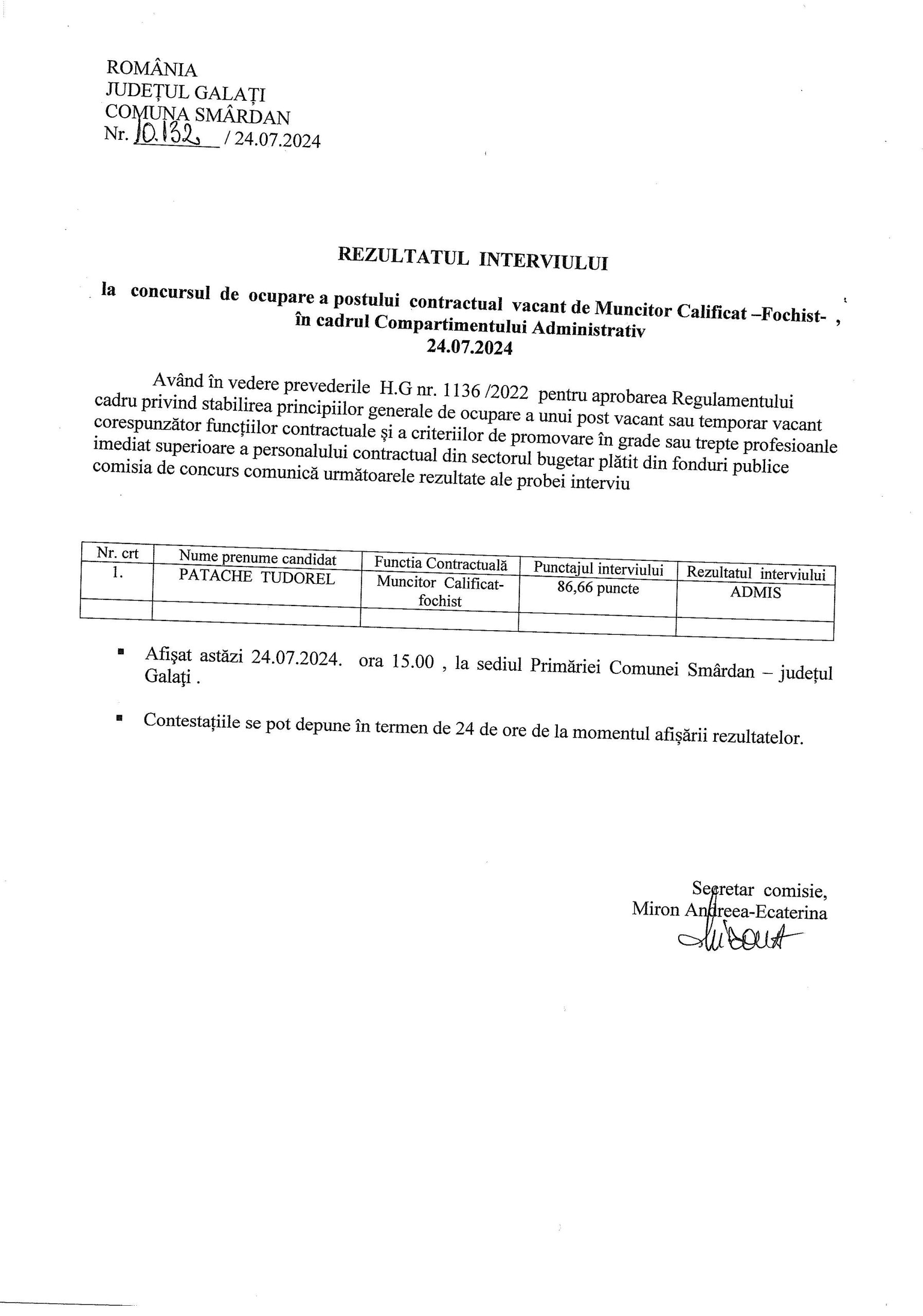 Rezultat Probă Interviu – Muncitor calificat – fochist